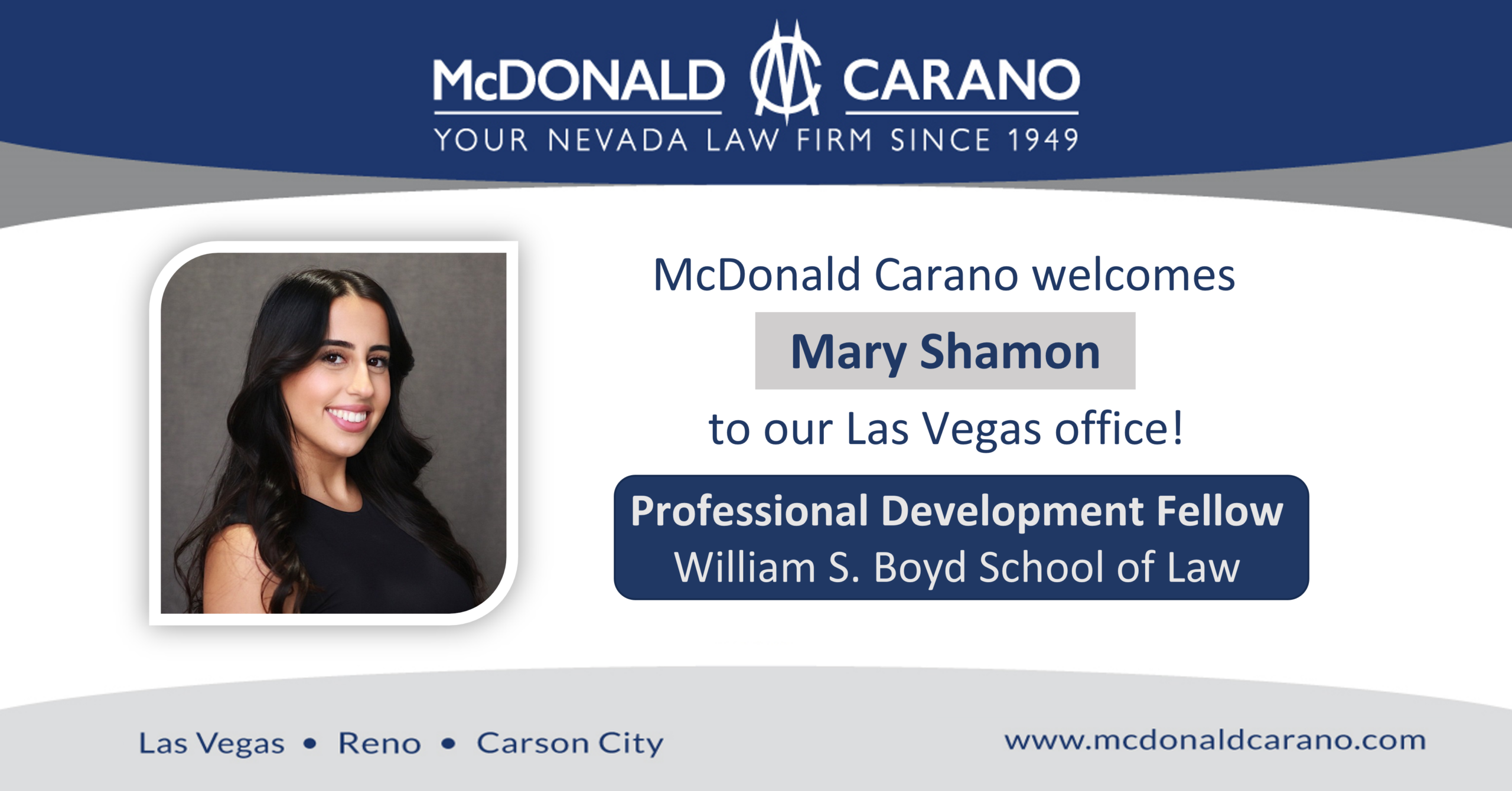 McDonald Carano welcomes Mary Shamon as a Law Clerk during her Spring Semester. Mary joins our Las Vegas office on January 26 through the Professional Development Fellowship Program of William S. Boyd School of Law, University of Nevada-Las Vegas. In addition to her legal studies, Mary is involved in the Nevada Law Journal, Sports and Entertainment Law Association, Intellectual Property Law Society, Organization of Women in Law Society, and Middle Eastern Law Student Association. Mary’s background includes serving as a Legal Clerk in the Criminal Division of the Superior Court of Stanislaus County and a committee member of the Nevada Women’s Lobby. Mary earned a B.A. in Politics from the University of California, Santa Cruz.